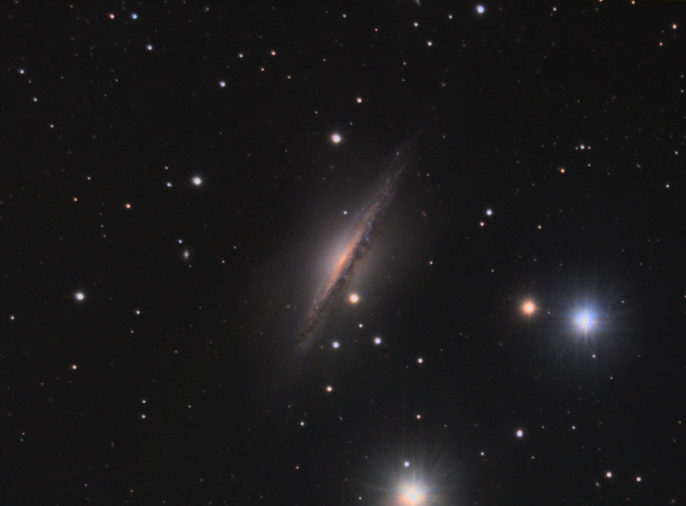 La galaxie NGC 891, située à environ 15 millions d'années lumière, est une des plus célèbres galaxies spirales vues de la tranche.
